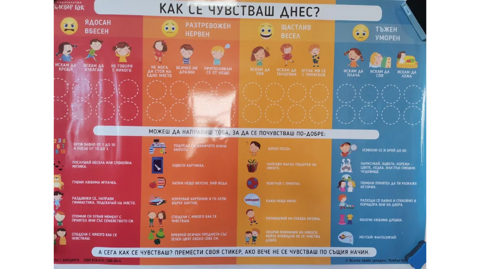 Основните инструменти, които използва в часовете си г-жа Стаменова, са табло с емоциите и детски терапевтични приказки. Таблото трябва да е поставено на видно място, тъй като се използва в началото и в края на учебния ден.