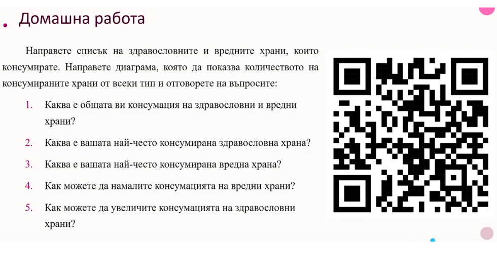 Учениците получават задача за домашна работа, която е с рефлективна цел - децата анализират хранителните си навици до момента и си поставят стъпки за по-здравословно хранене в бъдеще.