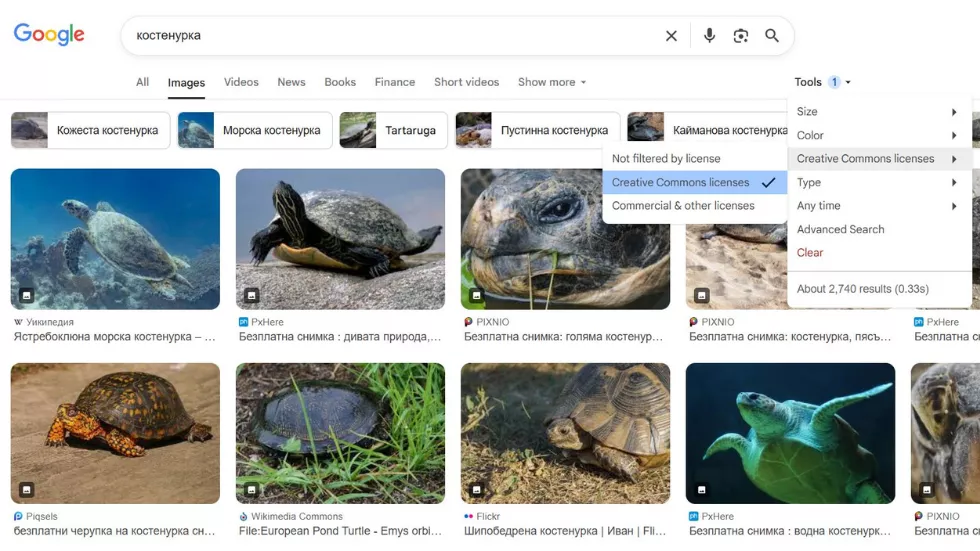- Права за ползване (Usage Rights): Това е най-важният филтър за отговорна дигитална употреба. Изберете “Лицензи Creative Commons” (Creative Commons licenses), за да намерите изображения, които авторите им са разрешили за повторно използване, често дори за търговски цели (винаги проверявайте конкретния лиценз).