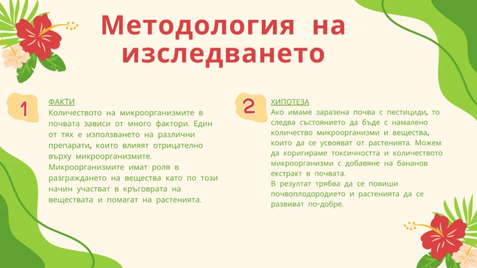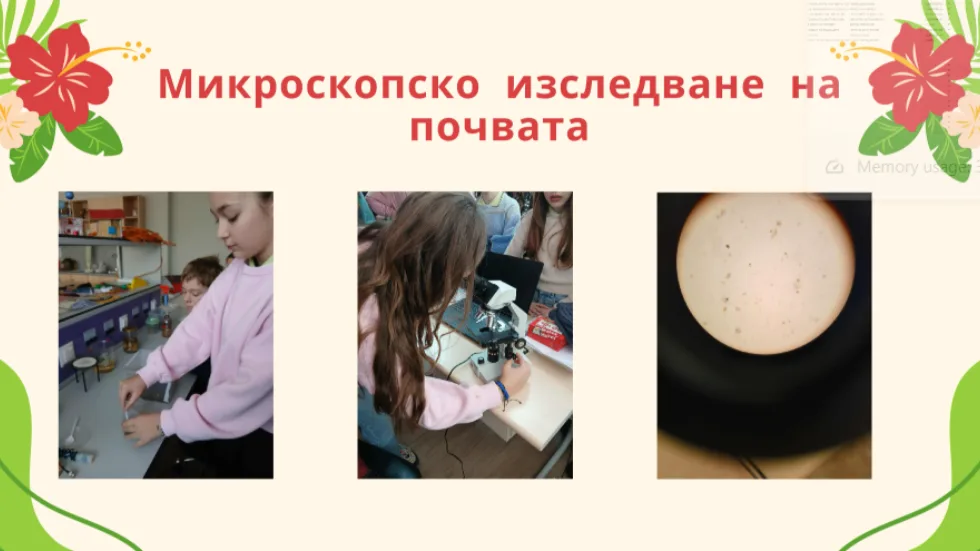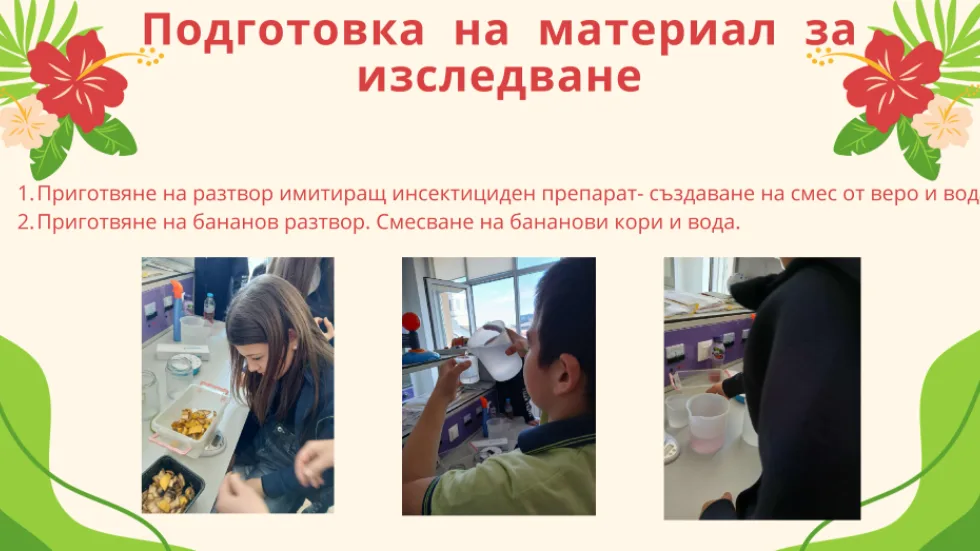 “В основата на експеримента стои идеята, че дори един обикновен банан може да се превърне в средство за промяна. Учениците приготвиха бананов екстракт и го използваха върху почва, предварително третирана с инсектициден разтвор. Чрез измервания, наблюдения и микроскопски анализи те доказаха, че банановият екстракт подпомага растежа на растенията и възстановява част от микробиалната активност в почвата”, разказва г-жа Шомова.