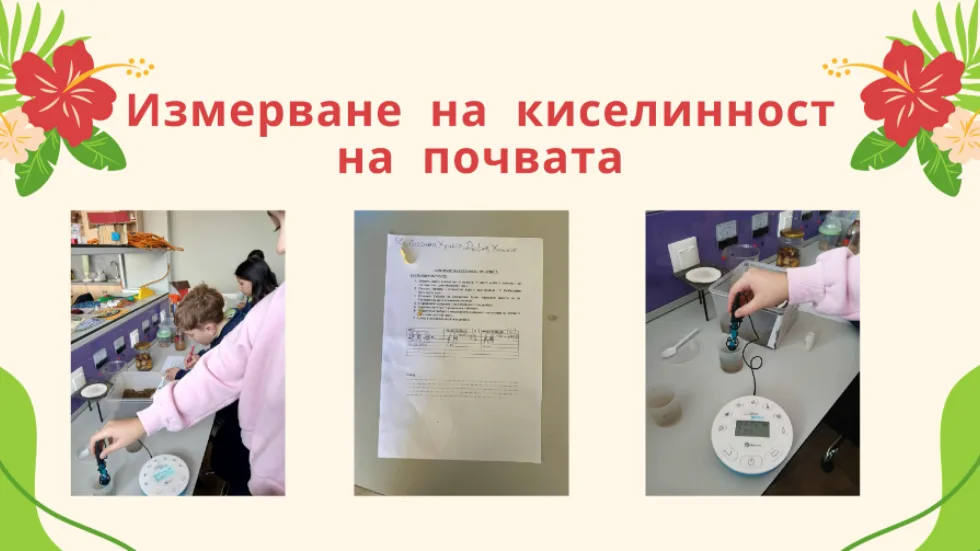 - Екип 1: Измерва киселинността на почвата и наблюдава промени при различни третирания;