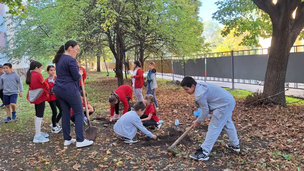 Засаждането на лалета в училищния двор превръща усилията на децата в реална, цъфтяща градина. Този финален етап затваря цикъла и доказва, че отпадъкът може да се материализира в красота.