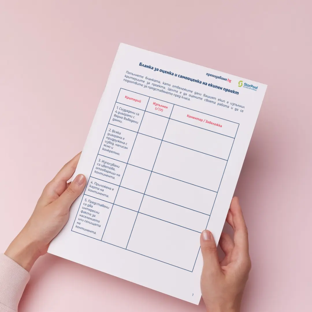Учениците представят своите екипни проекти – визуализации с диаграми и изводи за континента, по който са работили. Всеки екип разполага с до 2 минути за представяне. След това следва кратка самооценка по бланка и оценка от публика/другите екипи по предварително зададени критерии. Учителят фасилитира процеса и поддържа позитивна атмосфера.