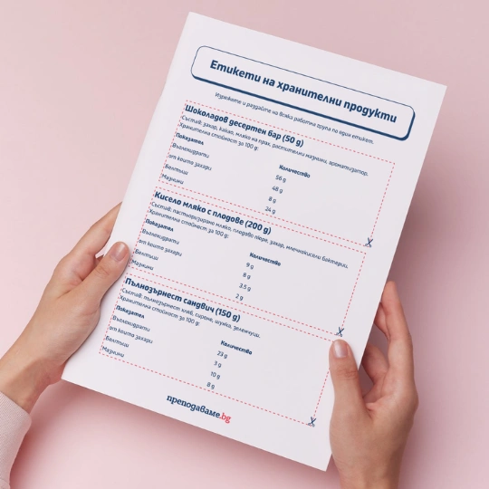“Сега ще изчислим хранителната и енергийната стойност на избрани хранителни продукти. За целта използвайте етикетите на хранителните продукти и насоките в работните листове, които ви раздадох.”