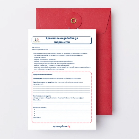 “На базата на всички проведени до момента проучвания, експерименти и анализи, трябва да създадете хранителна добавка, отговаряща на нуждите на спортисти и активно движещи се хора. Определете какви органични вещества трябва да съдържа вашия продукт и в какво съотношение. Изчислете каква енергийна и хранителна стойност трябва да има. Запишете идеите си в заданието, което ви раздадох.”