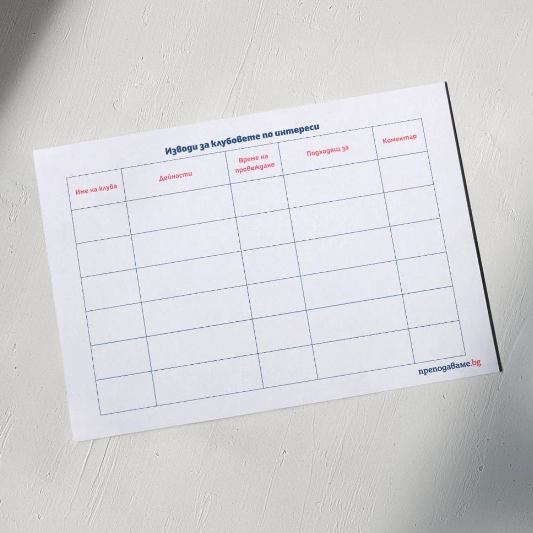 - Раздайте на всеки ученик разпечатаните текстове за откриване на клубове по интереси, както и таблицата с изводи за тях.