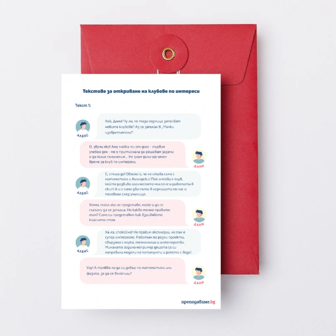 - Раздайте на всеки работните листове с текстовете за откриване на клубове по интереси и изводите за тях.