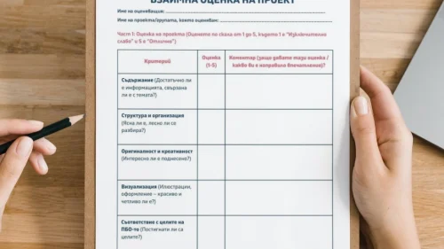 Използвайте работен лист “Лист за самооценка и взаимна оценка на проект” за структурирана обратна връзка и оценка (самооценка и взаимна оценка).