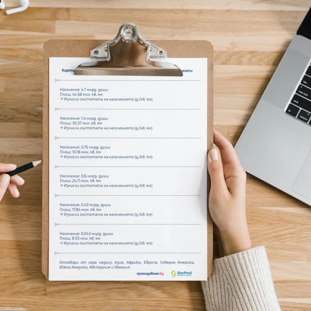 А сега е време за една последна задача. Всички ще получите по една карта с данни за определен континент – население и площ. Ще трябва да изчислите гъстотата на населението и да разберете за кой континент се отнася информацията. Как може да изчислите гъстотата?