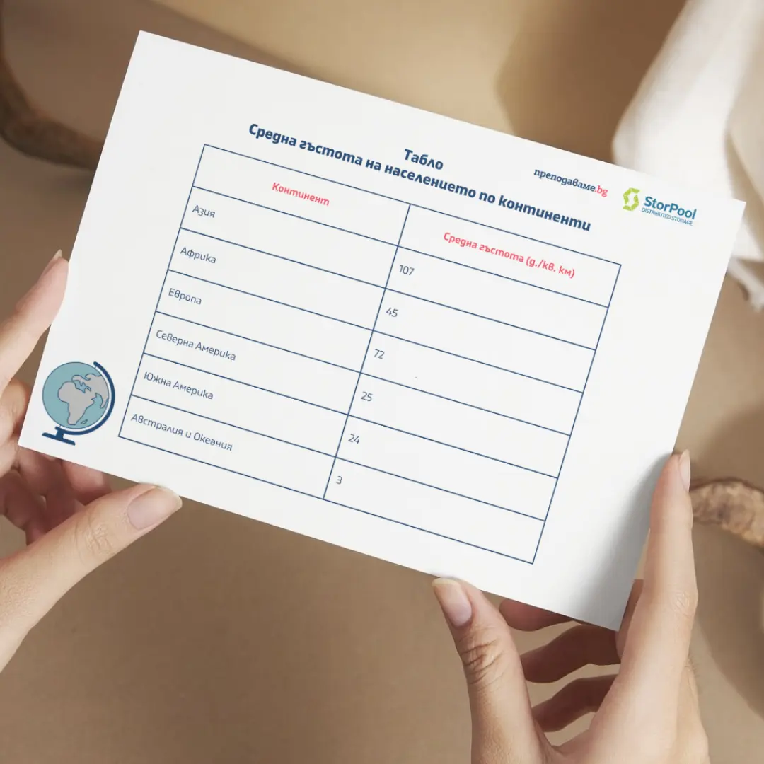 - Табло “Средна гъстота на населението по континенти”;