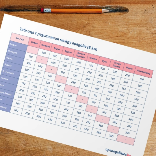 - Всяка група ще получи пътна карта на България и таблица с приблизителни разстояния между някои градове. Да погледнем таблицата, за да се ориентирате как да търсите разстояния на нея.