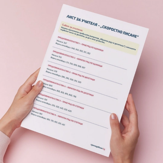 - Започва второто състезание от турнира. Пригответе химикалки и състезателните си карти. Слушайте внимателно числото и правилото, което казва учителят. Бързо запишете следващите 5 числа според правилото - прав или обратен ред по единици, десетици или стотици. Ще имате 6 предизвикателства, като за всяко ще получавате по една точка. Когато приключим играта, ще проверим дали са верни и ще напишете своите точки.