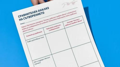 Учениците четат легендата "Господ и дяволът правят света" и библейския разказ за сътворението, след което работят по двойки и попълват работен лист “Сравнителен анализ на сътворението” за сравнение на сюжет, герои, мотиви и послания.
