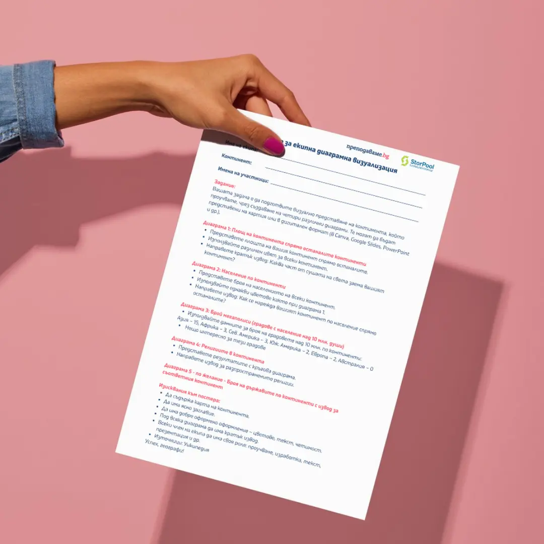 - Представете задачата възможно най-ясно: всяка група вече представлява определен континент, който ще трябва да представи чрез диаграми, съобразени цветово и визуално с тематиката. Подчертайте, че всяка диаграма трябва да има извод, който да показва какво научаваме от нея. Насърчете учениците да използват данни от учебника, атласа или онлайн източници.