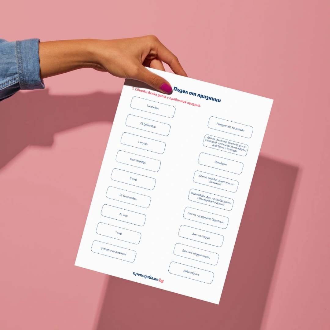 Учениците научават за официалните празници в България, докато подреждат пъзел, и обсъждат с какво всеки един от тях е значим за обществото. Те получават работен лист с информация за девет празника в България, които трябва да свържат с датата, на която ги отбелязваме.