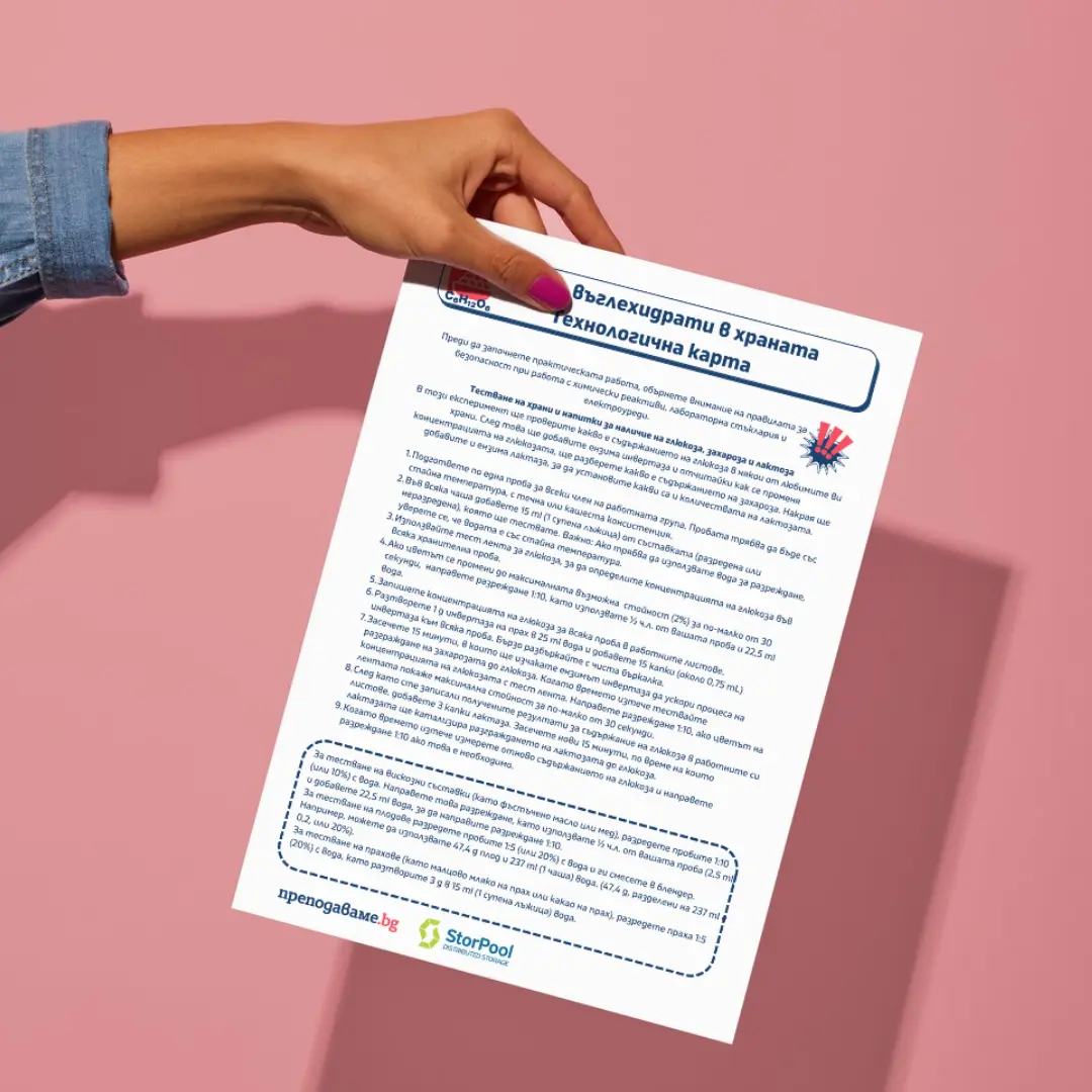 Сега ще проверим какви количества от различните видове въглехидрати се съдържат във вашите проби. Нека всяка работна група да избере по един продукт за всеки ученик в екипа, който да бъде тестван по време на експеримента. В технологичните карти,които ви раздадох има ясни инструкции как да приведете пробите си в подходящ вид за изследване. След това трябва да определите количеството на глюкозата, захарозата и лактозата в пробите, като следвате стъпките, посочени в технологичните карти.
