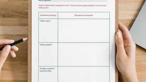 Разделете се на групи по 3-4 ученика. Всеки от вас ще получи текста на песента и работен лист “Анализ на народна песен. Задачите са следните: