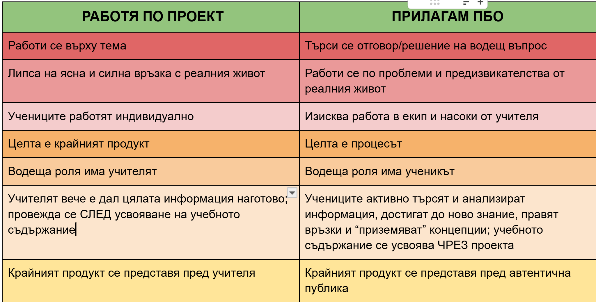 - ПБО е процес на учене чрез идентифициране на реален проблем и разработване на решението му. Децата показват наученото като „пътешестват“ през разнообразни теми и материала по различните учебни предмети, а не се фокусират само върху конкретния урок, който преподавате в момента.”. Това се постига като учителят насърчава учениците да идентифицират през изследване истински световен проблем (на местно или глобално ниво), да разработят решение, прилагайки доказателства за подкрепа и да представят решението по интересен и интерактивен начин.