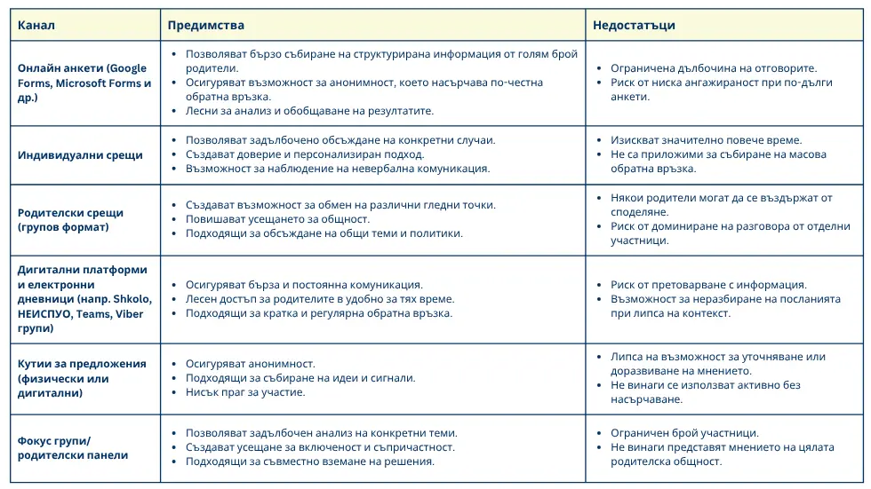 Изборът на подходящ канал за обратна връзка е ключов за ефективността на комуникацията с родителите. Различните формати имат своите предимства и ограничения, затова добрата практика е да се комбинират няколко канала според целта и контекста.