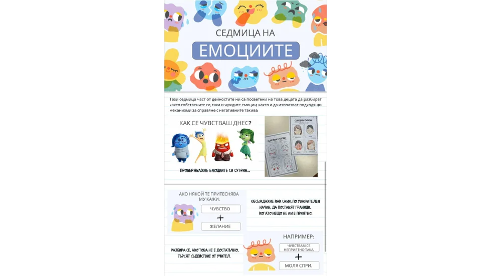 Нека разгледаме примера на Полина със “Седмица на емоциите”. Тази тема е сред първите реализирани, тъй като е изключително важна за адаптацията на малчуганите.