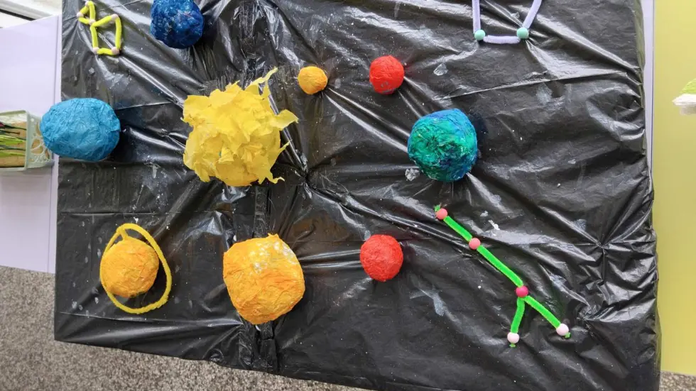 Екип Вояджър“ изработиха макет на Слънчевата система, използвайки техниката папиемаше. За основата четвъртокласниците оползотворяват отпадъчно парче фибран, обвито в черен найлонов чувал. Децата моделират планетите от стари вестници и брошури, конец и салфетка за най-горния слой на планетите. След изсъхване на макета те оцветяват небесните тела с темперни бои.