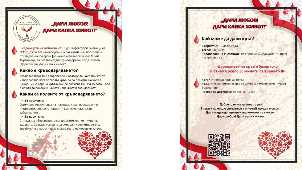Мащабно събитие, организирано с подкрепата на Отделението по трансфузионна хематология, МБАЛ Търговище и местната медия "Targovishte BG". В кампанията се включват 21 кръводарители, от които 9 са ученици от професионалната гимназия.