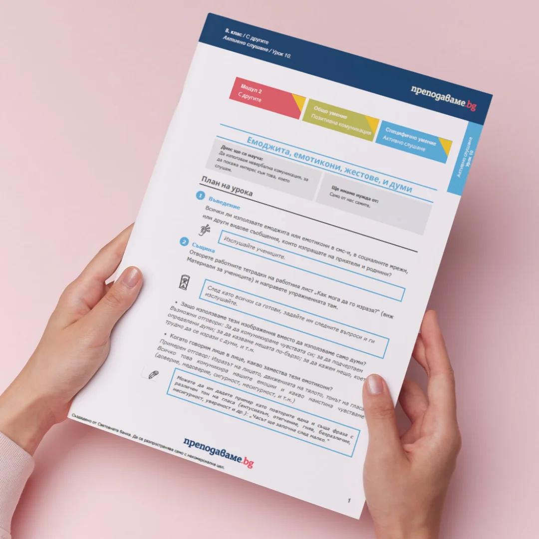 В този урок учениците ще изследват какво означава активно слушане и защо то е важно за ефективната комуникация. В началото на часа те ще обсъдят ролята на емотиконите в дигиталното общуване и как хората изразяват емоции при разговор лице в лице чрез изражение на лицето, език на тялото и тон на гласа. Целта е учениците да осъзнаят, че комуникацията не се състои само от думи, а включва и множество невербални сигнали, които предават чувства и намерения.