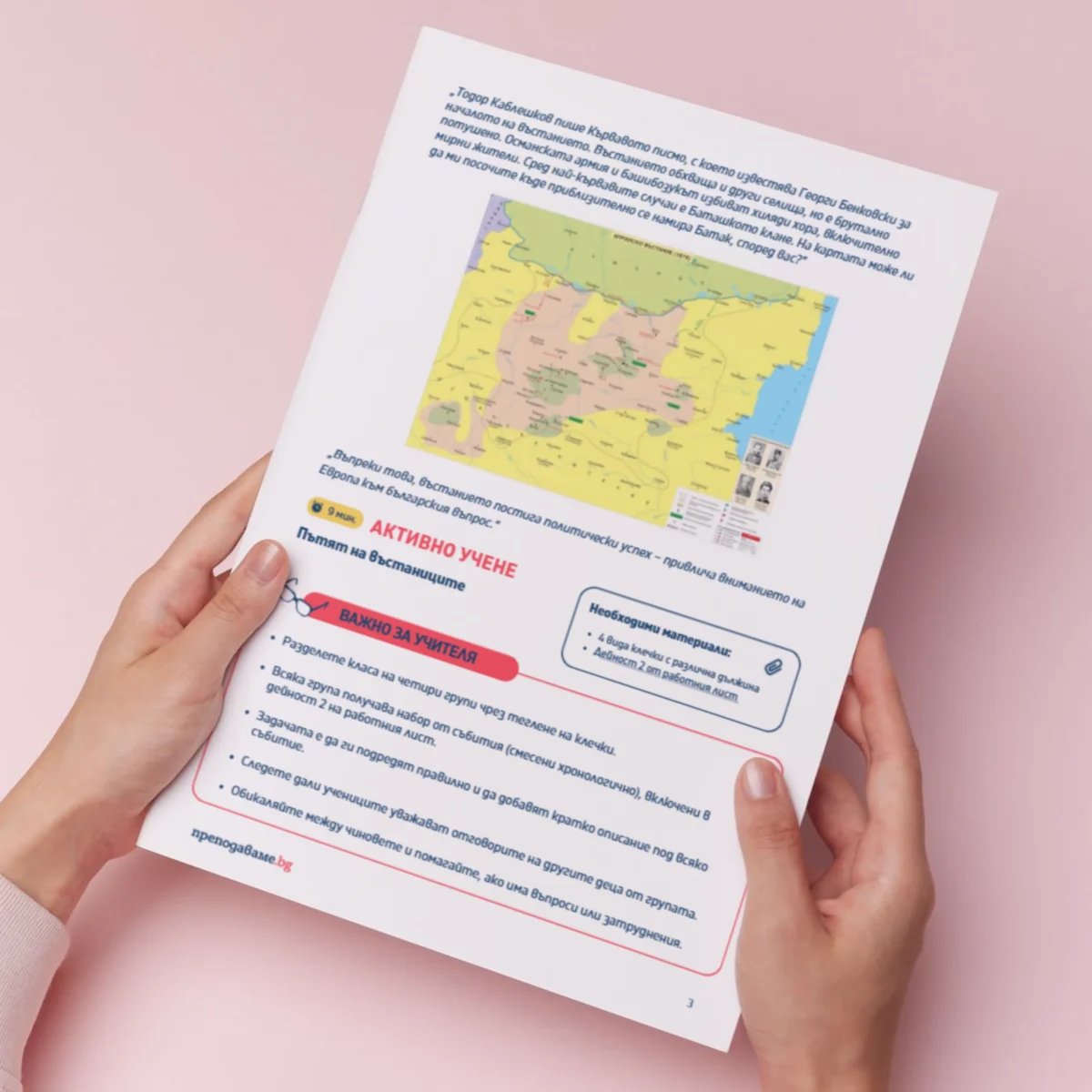Активното учене е под формата на групова задача със заглавие „Пътят на въстаниците“. Учениците се разделят на четири групи чрез теглене на клечки. Всяка група получава набор от събития от периода ноември 1875 – май 1876 г. (включени в Дейност 2 от работния лист), които трябва да подредят хронологично. Към всяко събитие учениците трябва да добавят кратко пояснение – какво се случва и защо е важно.