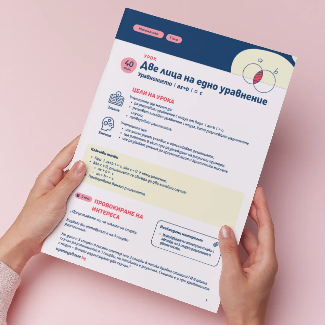 В този урок по Математика за 7. клас учениците ще изследват специфичните особености на уравненията с модул от вида ∣ax+b∣=c, като акцентът е върху разбирането на логиката зад различните случаи и умението да се проверяват решенията. Урокът комбинира работа по примери, дискусия в екип и ролеви задачи, които развиват аналитично и критическо мислене.