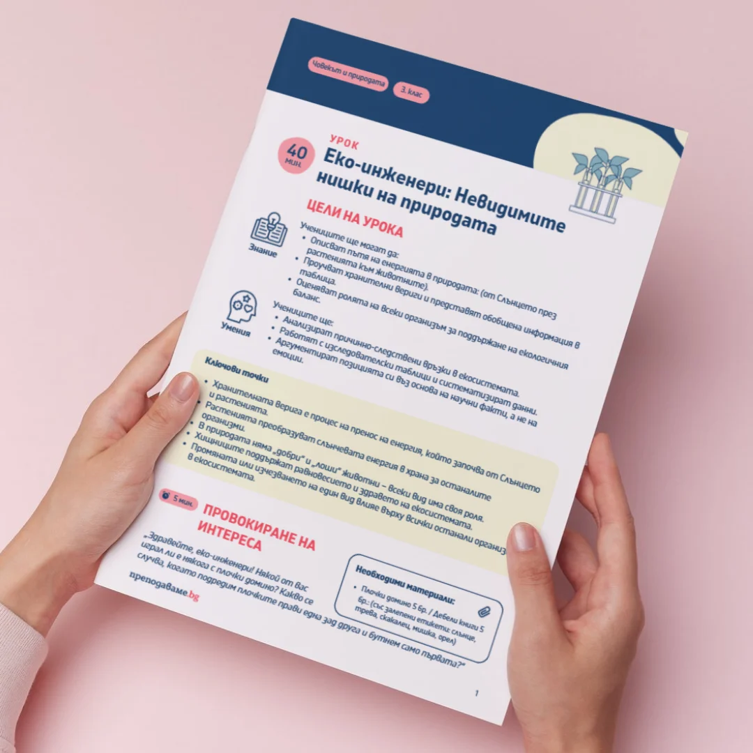 - Във файла за изтегляне ще откриете цялостно разработен урок, създаден специално за учителя. Той включва подробни инструкции за провеждане на дейностите, ясни задачи и насоки за работа с учениците, както и готови работни листове, които може лесно да разпечатате и използвате в час. Така всичко необходимо за успешното провеждане на урока е под ръка, за да се фокусирате върху активното учене и ангажираността на децата.