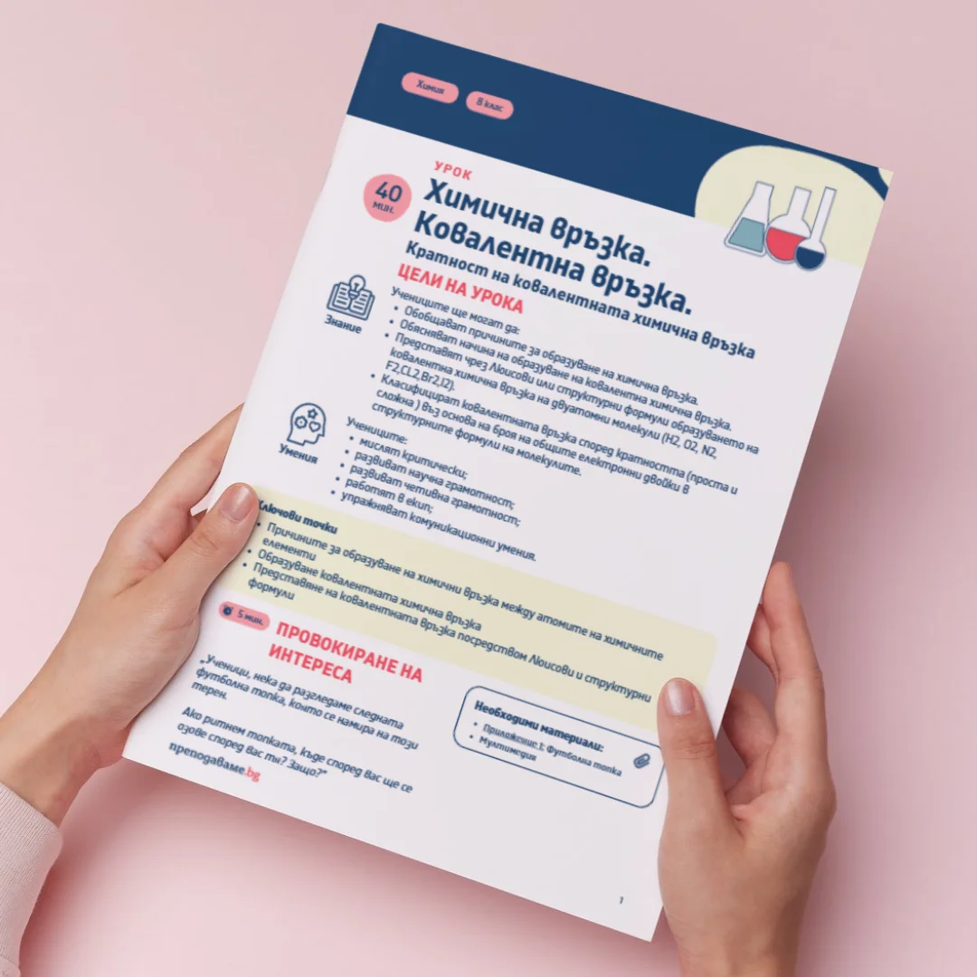 В този урок по Химия за 8. клас учениците ще изследват природата на химичната връзка, като акцентът е поставен върху ковалентната връзка и нейната кратност. Те ще разберат защо атомите се свързват, как се образуват общи електронни двойки и как тези взаимодействия се представят чрез Люисови и структурни формули. Чрез анализ на модели, работа с диаграми и практическо представяне на връзките учениците ще развият логическо мислене, научна грамотност и способност за аргументирано обяснение на химични явления.
