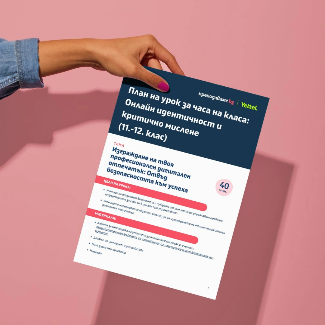 В този практически насочен урок учениците ще изследват значението на своята онлайн идентичност и ще разберат как дигиталното им присъствие влияе на тяхното бъдеще – личностно, образователно и професионално. Чрез самооценка, анализ на реални сценарии и дискусии, те ще развият умения за критично мислене и стратегическо поведение в дигитална среда.