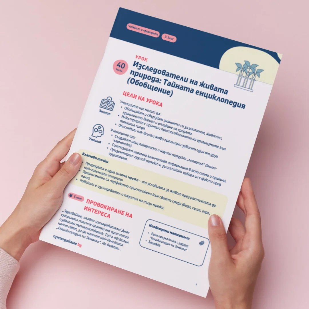 В този урок по Човекът и природата за 3. клас учениците ще обобщят и систематизират знанията си за живата природа чрез създаване на цялостен творчески и научен продукт. Акцентът е върху свързването на понятията за растения, животни, хранителни вериги и опазване на околната среда чрез проектно-базирано обучение, екипна работа и аргументирано представяне.