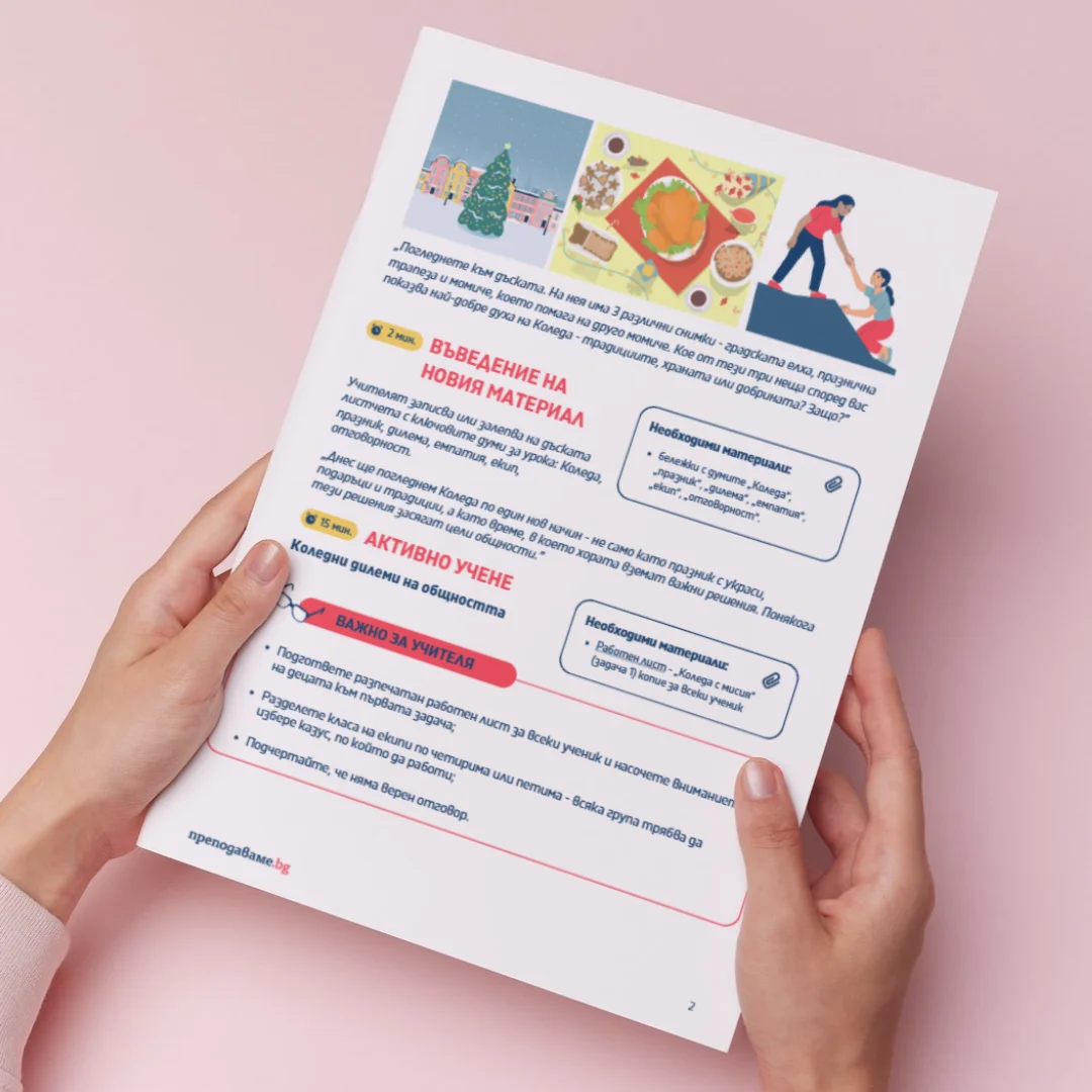 В този урок по Литература за 5. клас учениците ще изследват темата „Коледа с мисия“ чрез обсъждане на коледни традиции, обществени инициативи и личната отговорност към общността. Акцентът е върху разбирането на празника като време за съпричастност и активна позиция, като се използват казуси, работа в екип и дискусия за търсене на реални решения на житейски ситуации.