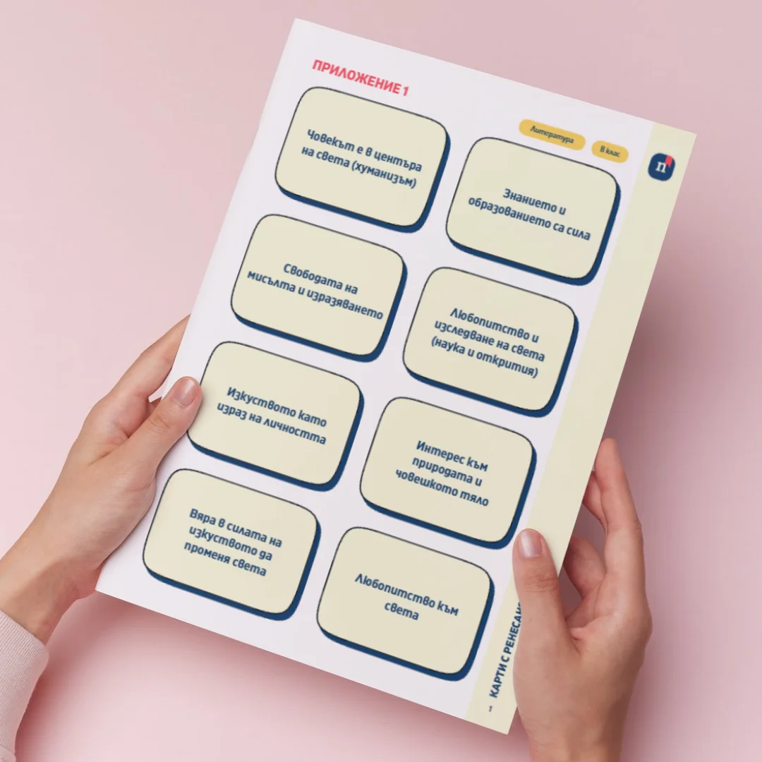 В основната активност „Близки ли са ни идеите на Ренесанса?“ учениците работят в малки групи, като разглеждат една ключова хуманистична идея, представена върху работна карта. Те обсъждат дали тази идея е важна и днес и подкрепят мнението си с пример от ежедневието или личния си опит. Учениците разпределят роли, работят в рамките на 7-8 минути и записват основните си изводи. След това говорителите на групите представят резултатите накратко, а класът сравнява различните идеи, обсъжда значението им и прави връзка между Ренесанса и съвременния свят.