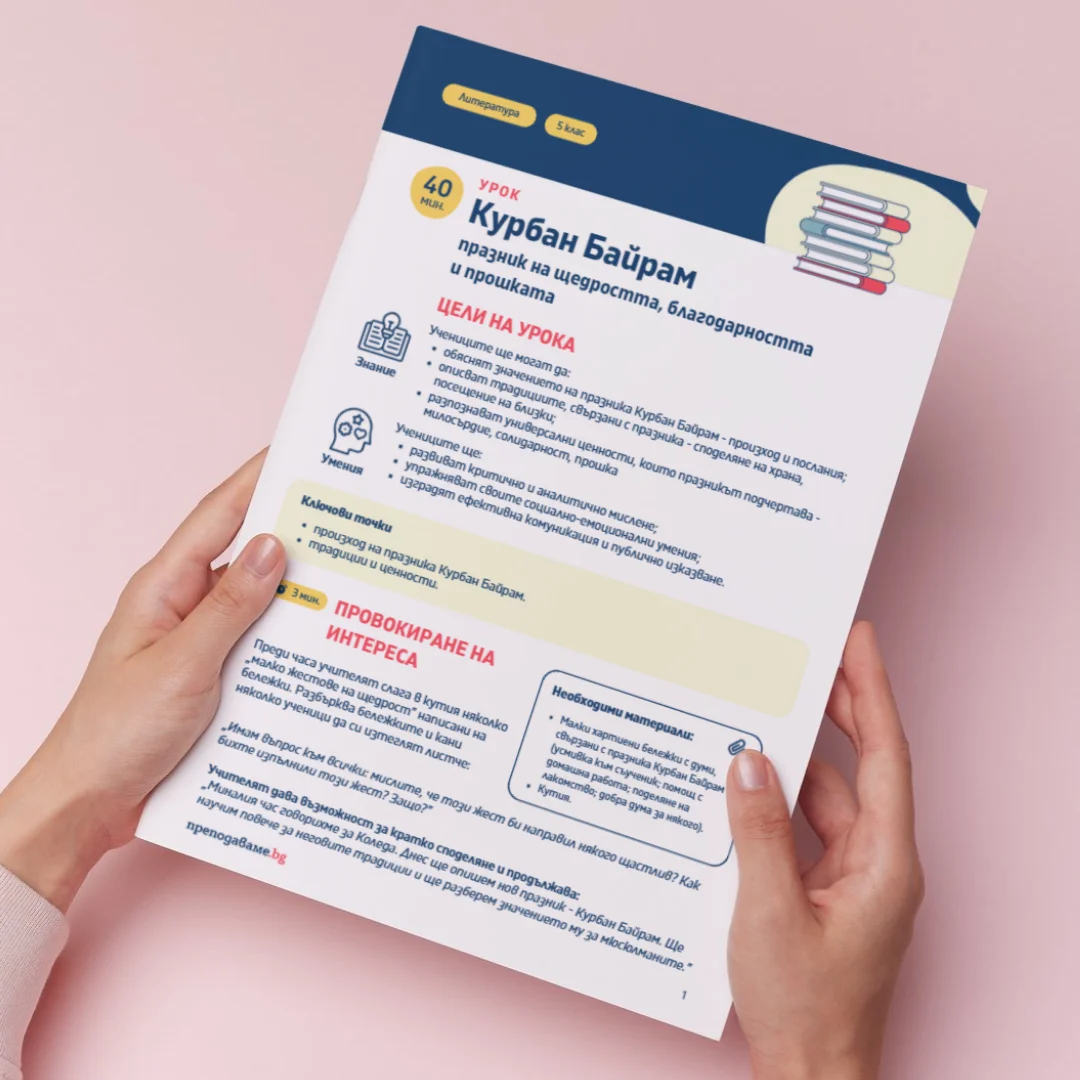 В този урок по Литература за 5. клас учениците ще се запознаят с празника Курбан Байрам, неговия произход и посланията, които носи. Акцентът е върху разбирането на традициите и универсалните ценности на празника – милосърдие, солидарност и прошка – чрез анализ, символни дейности и обсъждане в подкрепяща среда.