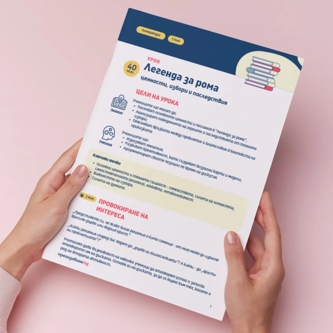 В този урок по Литература за 5. клас учениците ще задълбочат разбирането си за произведението „Легенда за рома“, като изследват неговите ценности, избори и последствия. Акцентът е върху връзката между постъпките на героите и техните резултати, както и върху осмислянето на понятията проклятие и благословия в контекста на текста. Чрез анализ, самостоятелна работа и насочена дискусия учениците ще развият умения за аргументация, емпатия и личностна рефлексия.