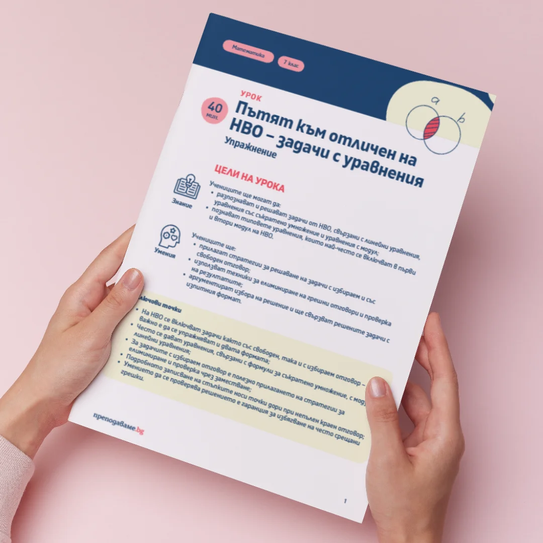 В този урок по Математика за 7. клас учениците ще се подготвят целенасочено за задачите с уравнения от Националното външно оценяване, като работят върху най-често срещаните формати и типове уравнения. Акцентът е върху разпознаването на изпитните структури, прилагането на надеждни стратегии и аргументирането на решенията чрез активно сътрудничество.