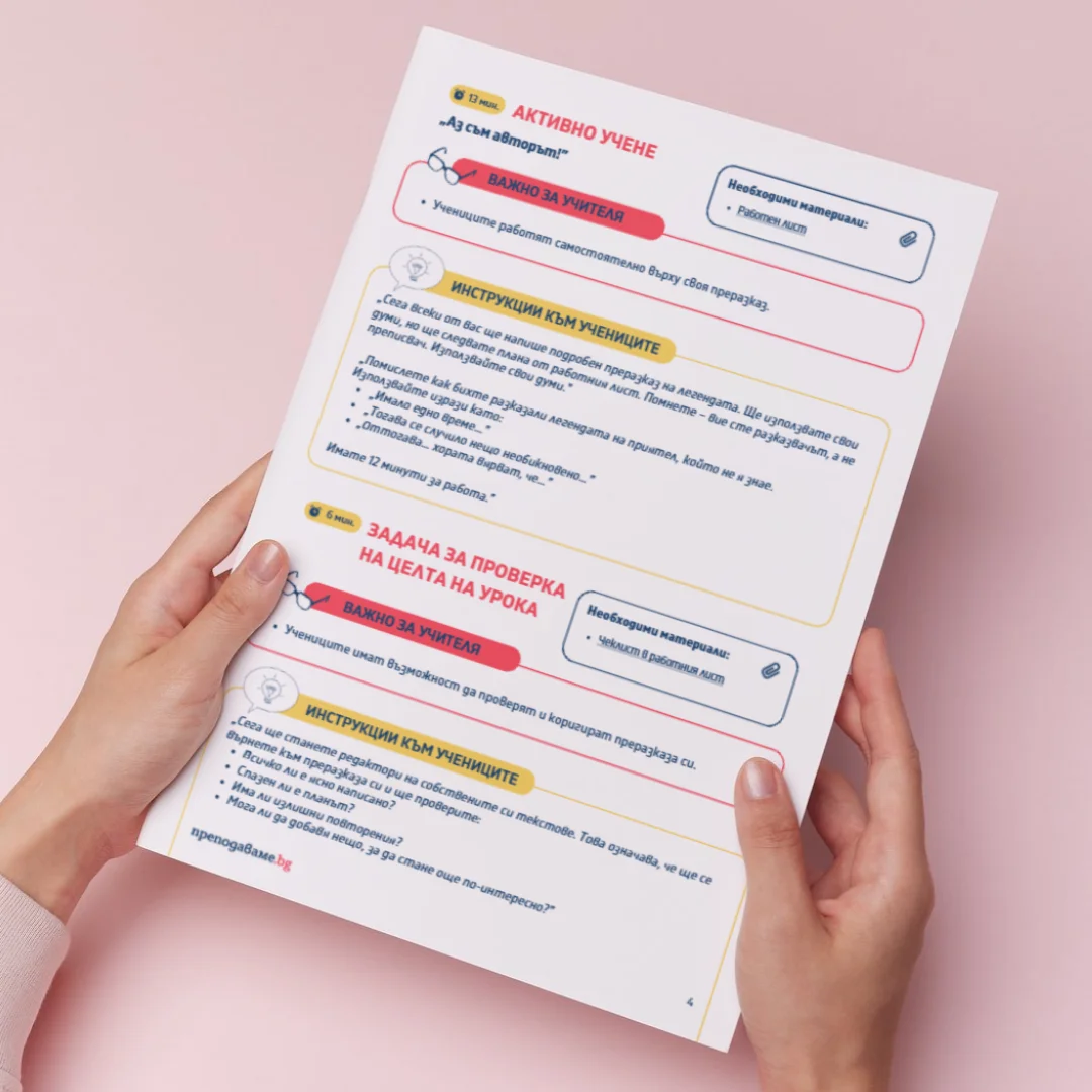 - Във файла за изтегляне ще откриете цялостно разработен урок, създаден специално за учителя. Той включва подробни инструкции за провеждане на дейностите, ясни задачи и насоки за работа с учениците, както и готови работни листове, които може лесно да разпечатате и използвате в час. Така всичко необходимо за успешното провеждане на урока е под ръка, за да се фокусирате върху активното учене и ангажираността на децата.