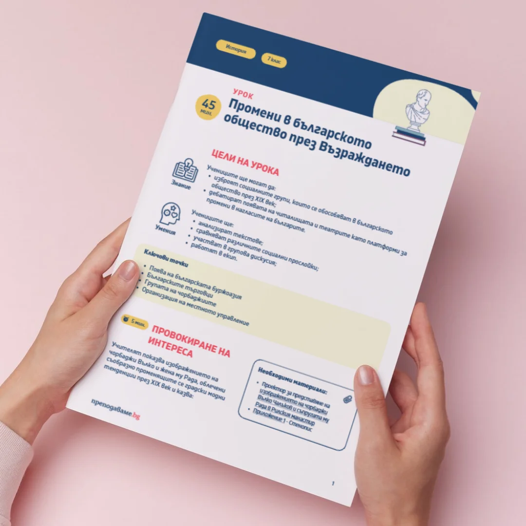 В този урок по История за 7. клас учениците ще изследват какви промени настъпват в българското общество през Възраждането, като акцентът пада върху разпознаването на новите социални групи и ролята на читалищата и театрите за формиране на модерни нагласи. Урокът комбинира анализ на текстове, групови дискусии и съпоставителни дейности, за да насърчи активно участие и задълбочено разбиране на процесите от XIX век.
