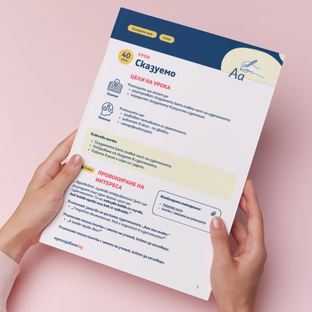 - Във файла за изтегляне ще откриете цялостно разработен урок, създаден специално за учителя. Той включва подробни инструкции за провеждане на дейностите, ясни задачи и насоки за работа с учениците, както и готови работни листове, които може лесно да разпечатате и използвате в час. Така всичко необходимо за успешното провеждане на урока е под ръка, за да се фокусирате върху активното учене и ангажираността на децата.