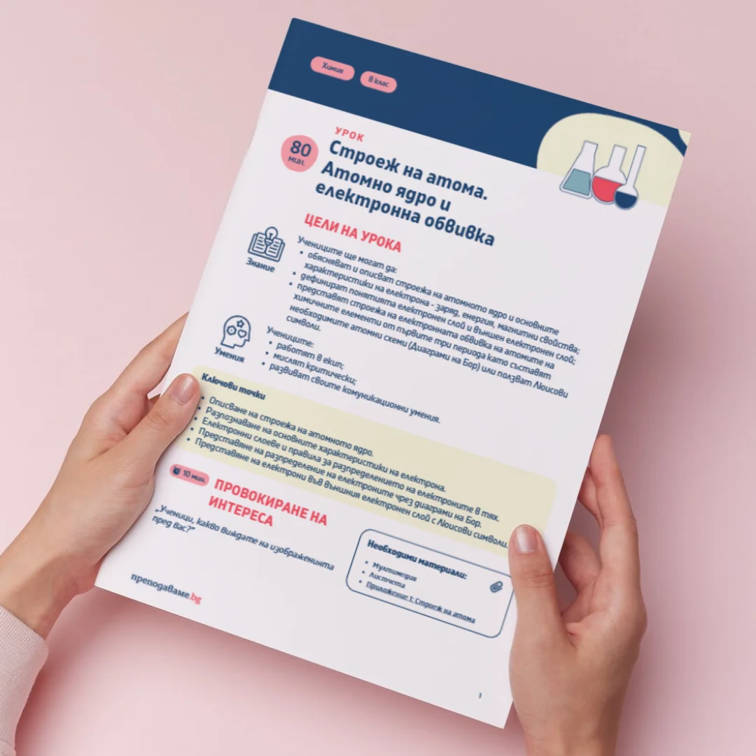 В този урок по Химия за 8. клас учениците ще изследват строежа на атома, като се запознаят подробно с атомното ядро и електронната обвивка. Акцентът е върху връзката между състава на атома, свойствата на частиците в него и начина, по който електроните се разпределят в електронни слоеве. Чрез практическа работа с диаграми на Бор и Люисови символи, екипна дейност и дискусия учениците ще изградят стабилно разбиране за микроструктурата на веществата.