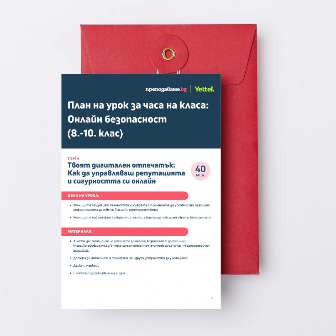 В този практически урок учениците ще научат какво представлява техният дигитален отпечатък и как онлайн поведението им влияе върху личната репутация и сигурността. Чрез попълване на анкета и анализ на измамни сценарии , учениците ще развият умения за критическо мислене и отговорно онлайн поведение.