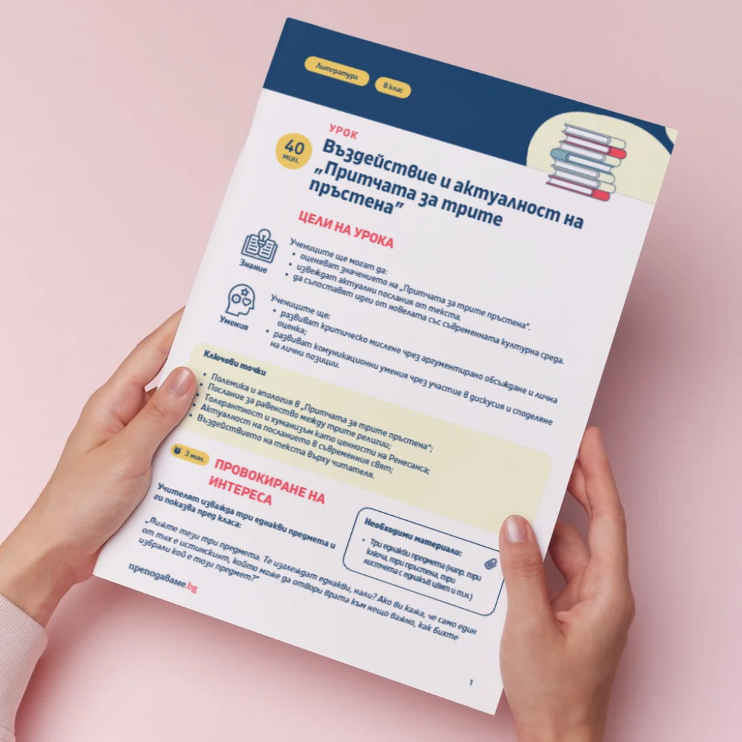 - Във файла за изтегляне ще откриете цялостно разработен урок, създаден специално за учителя. Той включва подробни инструкции за провеждане на дейностите, ясни задачи и насоки за работа с учениците, както и готови работни листове, които може лесно да разпечатате и използвате в час. Така всичко необходимо за успешното провеждане на урока е под ръка, за да се фокусирате върху активното учене и ангажираността на децата.