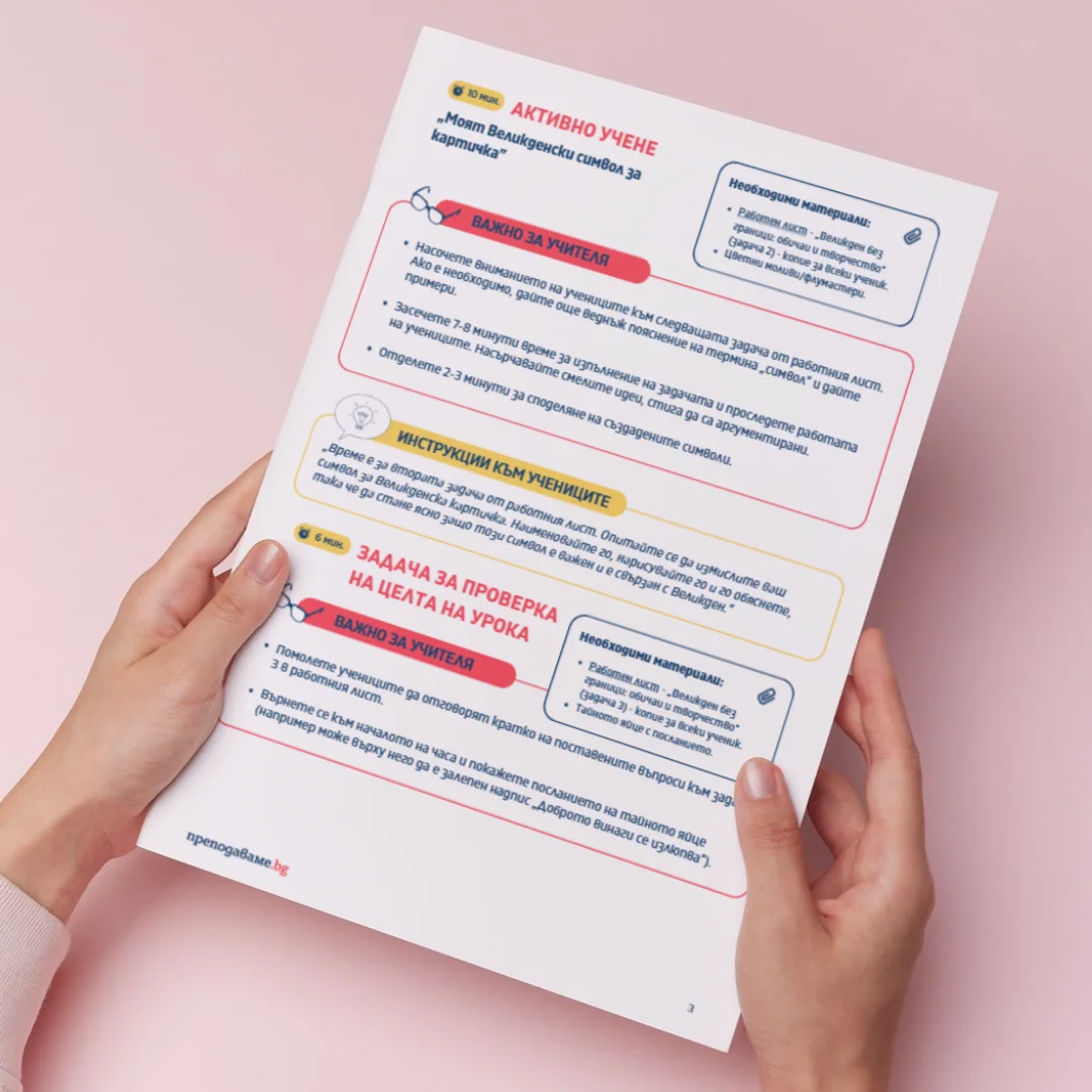 - Във файла за изтегляне ще откриете цялостно разработен урок, създаден специално за учителя. Той включва подробни инструкции за провеждане на дейностите, ясни задачи и насоки за работа с учениците, както и готови работни листове, които може лесно да разпечатате и използвате в час. Така всичко необходимо за успешното провеждане на урока е под ръка, за да се фокусирате върху активното учене и ангажираността на децата.