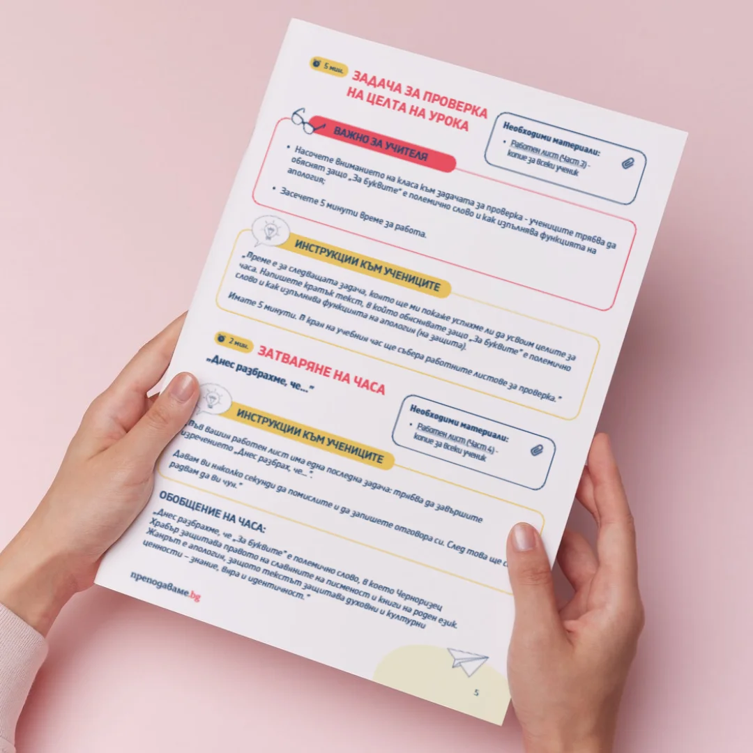 - Във файла за изтегляне ще откриете цялостно разработен урок, създаден специално за учителя. Той включва подробни инструкции за провеждане на дейностите, ясни задачи и насоки за работа с учениците, както и готови работни листове, които може лесно да разпечатате и използвате в час. Така всичко необходимо за успешното провеждане на урока е под ръка, за да се фокусирате върху активното учене и ангажираността на децата.