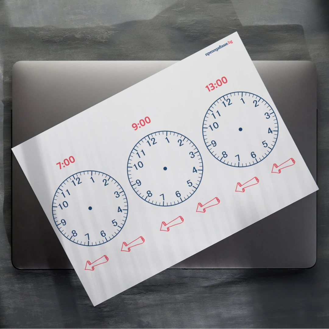 • Бъдете до плаката, докато учениците залепват часовниците. Подредените часовниците трябва да образуват кръг и всеки часовник следва да е на мястото на часа, който показва.