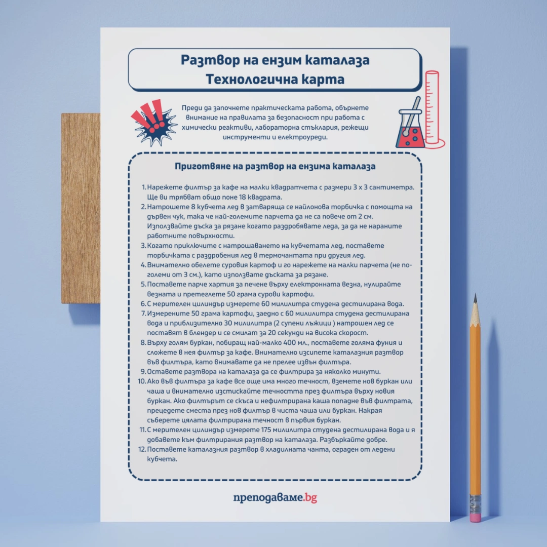 • “Следвайте внимателно стъпките в технологичната карта, която ви раздадох, като спазвате правилата за безопасност при работа с химически реактиви, режещи инструменти и електрически уреди.”