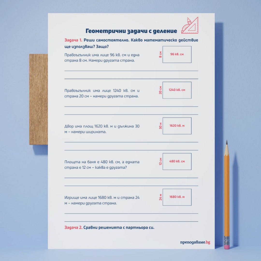 • Когато изпълните тази задача, получавате казус – планиране на помещение или външно пространство (напр. стая, баня, кухня, игрище). Изчислете липсваща страна или обща площ, като прилагате деление.”