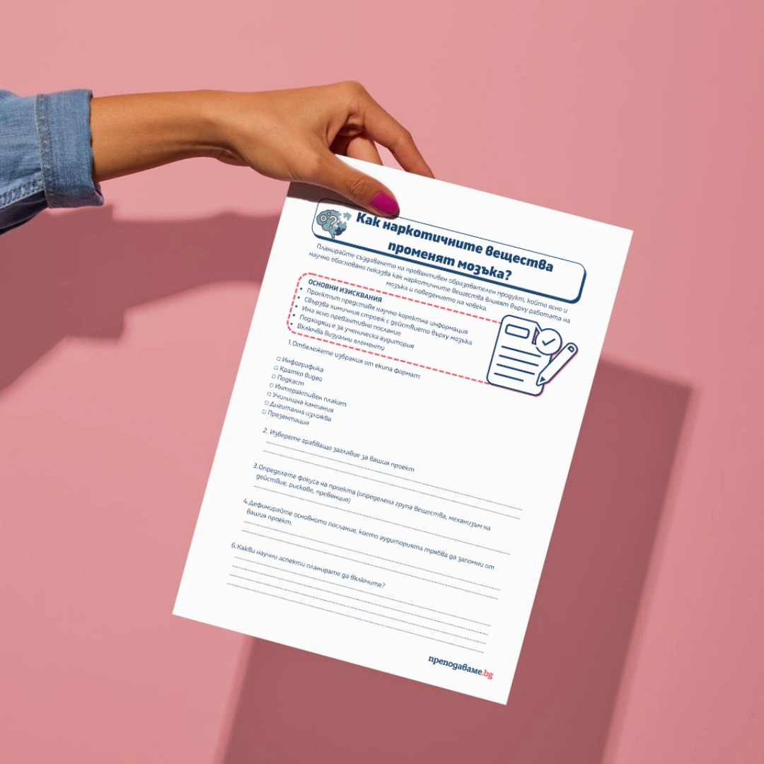- “Попълнете работните листове, които ви раздадох. Обяснете как химичният строеж на едно вещество може да повлияе на мисленето или поведението на човека.”